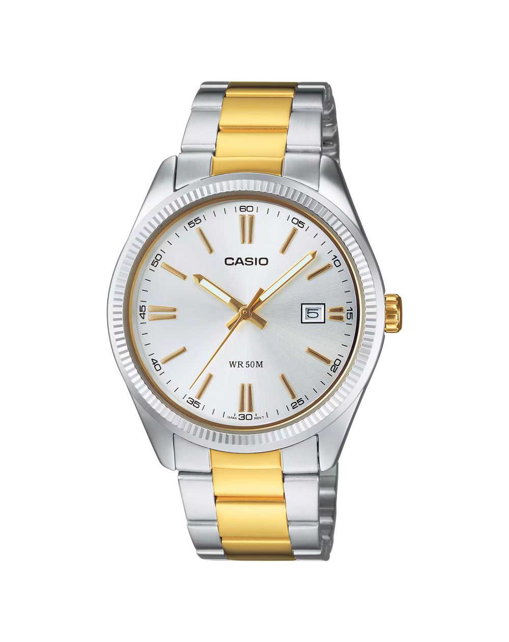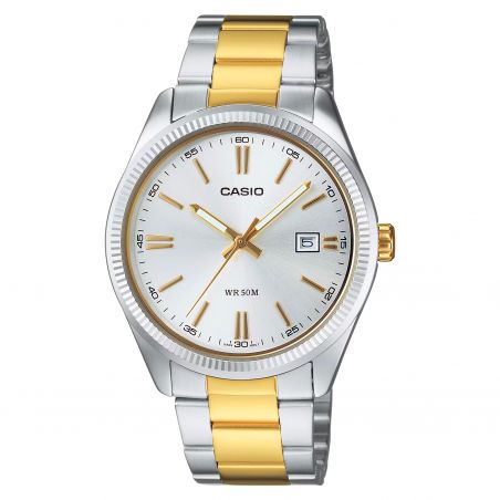 La Casio MTP-1302PSG-7AV séduit par son style classique et raffiné, idéal pour accompagner aussi bien les journées de travail que les occasions plus habillées. Son boîtier doré à placage ionique s'associe idéalement avec la couleur argenté.