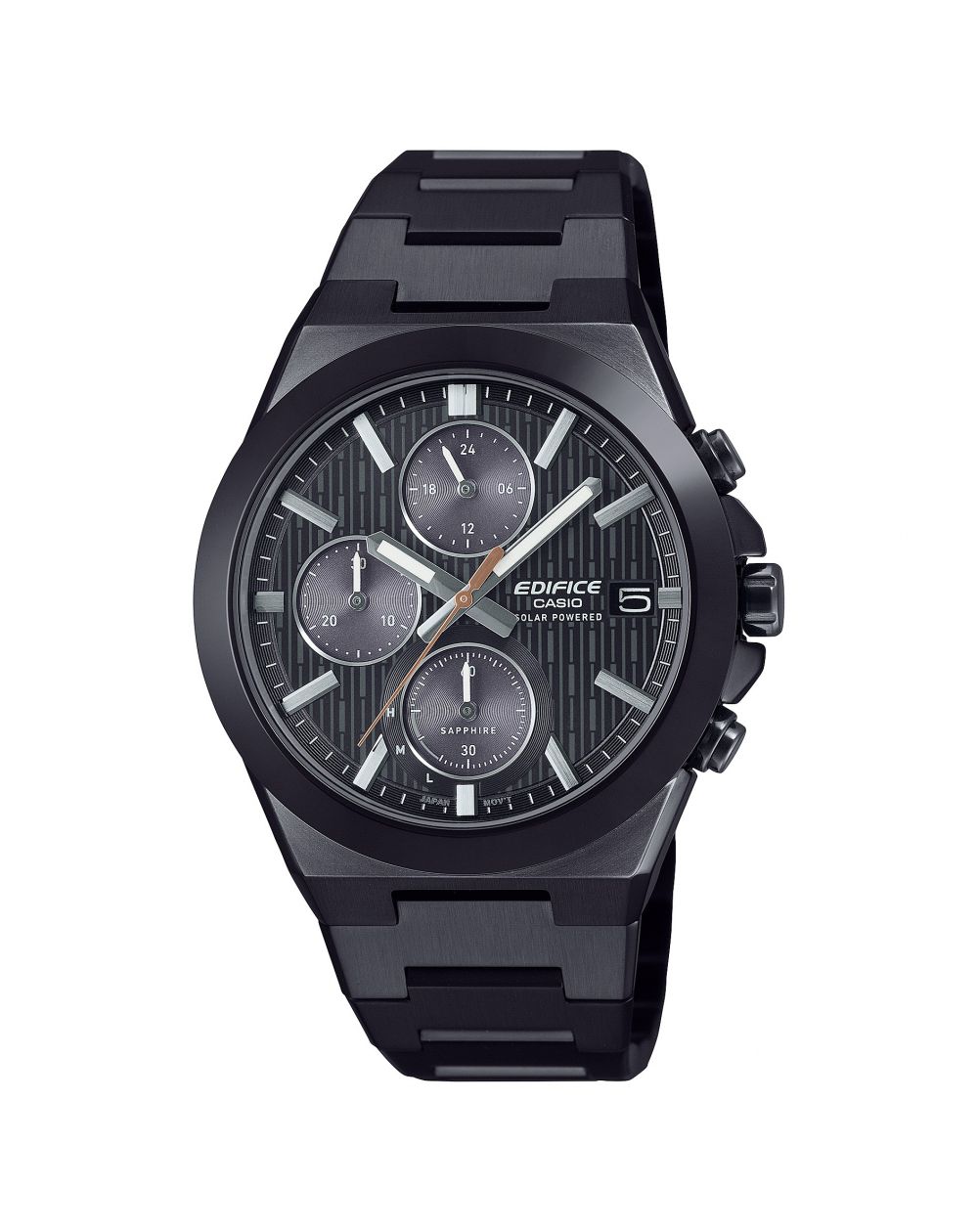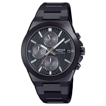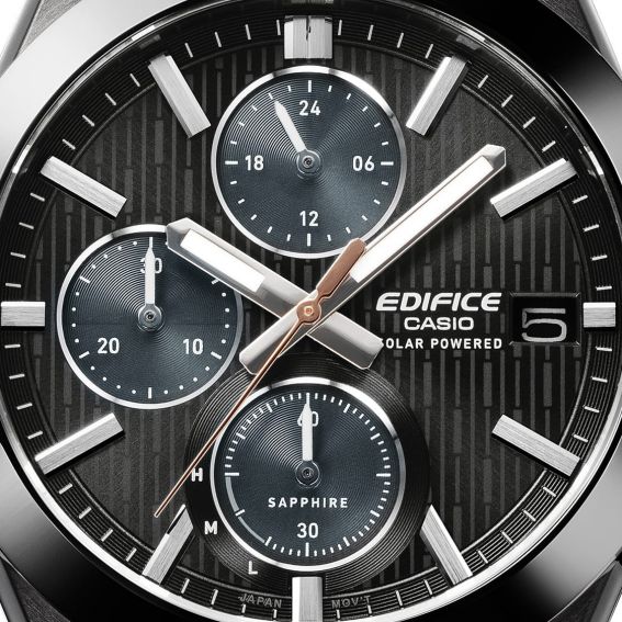 Pensée pour allier performance et confort au quotidien, cette montre Casio Edifice solaire est équipée d’un verre saphir avec traitement antireflet, garantissant une lisibilité optimale et une grande résistance aux rayures. Son cadran travaillé, agrémenté de compteurs subtilement intégrés, apporte profondeur et technicité à l’ensemble, tout en conservant une lecture claire et équilibrée.