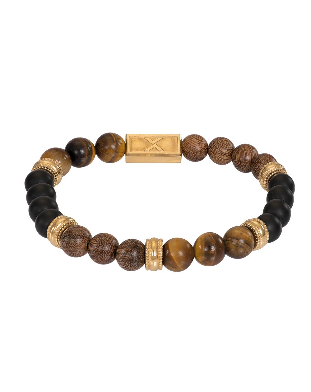 Ce bracelet de la marque iXXXi est un bracelet qui se compose d'une combinaison d'acier inoxydable de couleur or et de perles en bois de couleur brun foncé/noir.