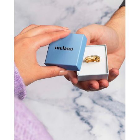 Le remarquable petit bijou Melano Twisted Secured est composé d'une grande zircone étincelante disponible dans des couleurs fraîches et estivales. Avec sa taille en damier, la pierre rappelle une fleur, entourée d'une cuve en acier formant des pétales. Le petit bijou Secured mesure 10 mm de large et est disponible avec un placage argent, or rose ou or.