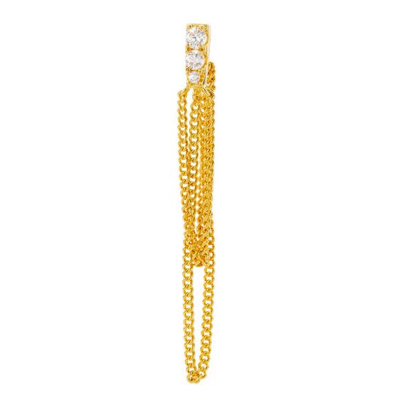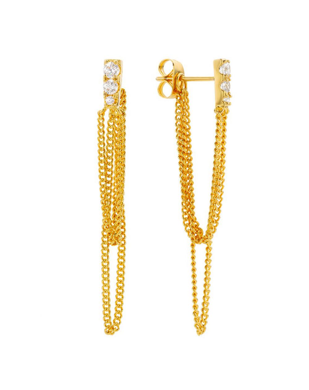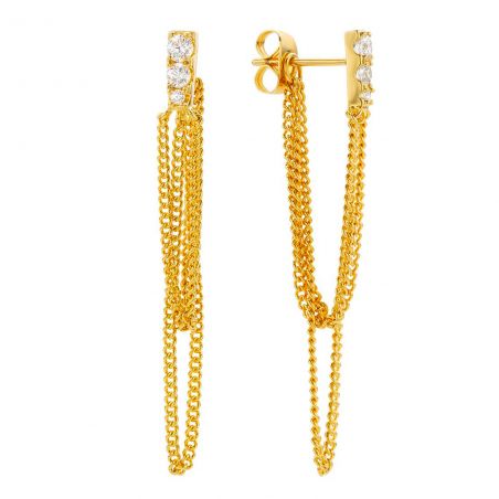 Ces boucles d'oreilles "Dancefloor" de MYABAY, en plaqué or, affichent un design long et frappant avec une chaîne de maillons lourds suspendue à une barre verticale ornée de pierres d'oxyde de zirconium. Ce modèle combine un style audacieux avec une touche de brillance, parfait pour ajouter une déclaration dramatique à vos tenues de soirée.