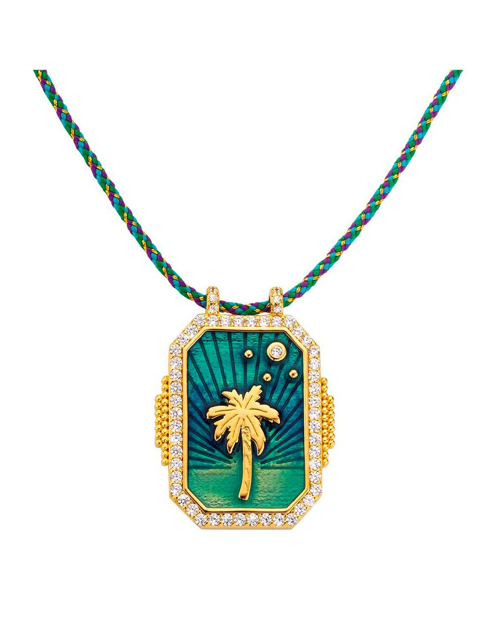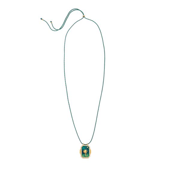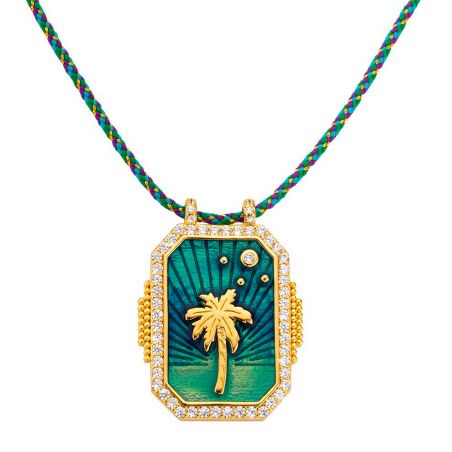 Ce collier Mya Bay arbore un pendentif vibrant avec une représentation en relief d'un palmier doré sur un fond émaillé vert émeraude. Le cadre du pendentif est en plaqué or et richement décoré d'oxydes de zirconium brillants qui ajoutent une touche de luxe. Le pendentif est suspendu à une chaîne tressée multicolore qui complète le design tropical. Ce bijou évoque l'évasion et le rêve, parfait pour ceux qui aiment apporter une touche d'exotisme et de couleur à leur style.
