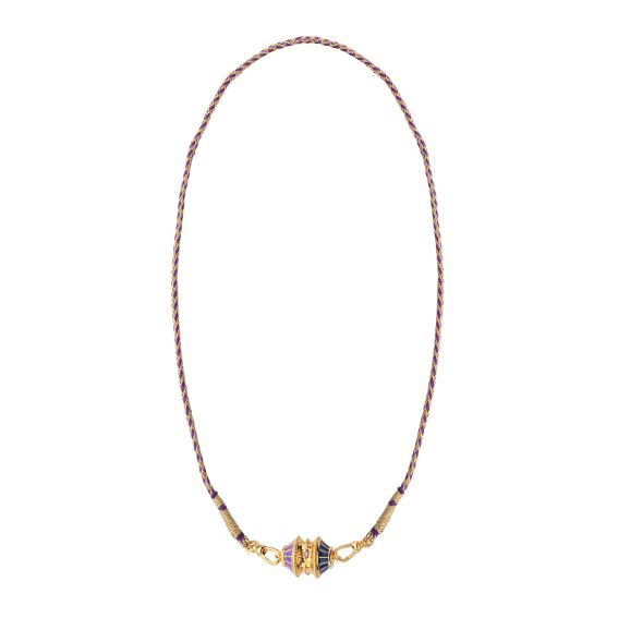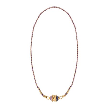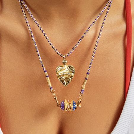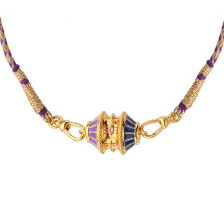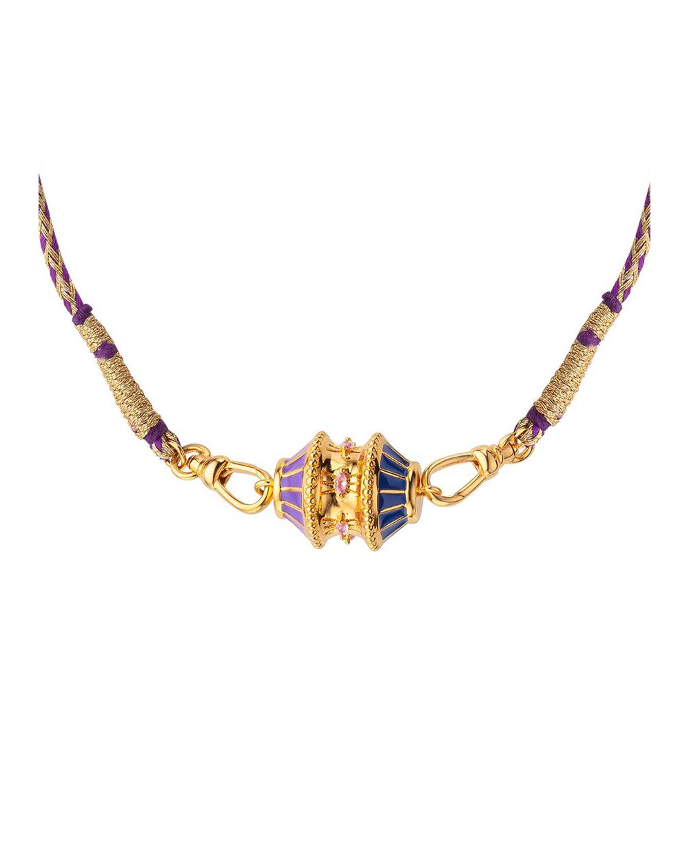 Ce collier Mya Bay arbore un pendentif central en forme de talisman, richement décoré avec un émail bleu et violet et incrusté d'oxydes de zirconium. Le design sophistiqué du pendentif est complété par une chaîne plaquée or qui alterne des maillons tressés et des sections plus classiques, offrant un contraste visuel captivant. Ce collier est une pièce de déclaration audacieuse, idéale pour les amateurs de bijoux qui cherchent à exprimer leur individualité avec style et élégance.
