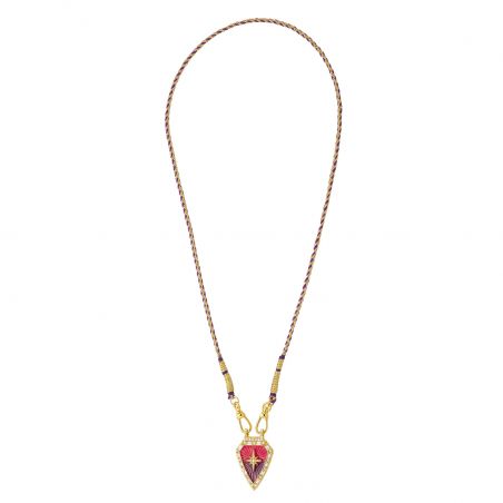 Le pendentif que vous avez partagé présente un design audacieux en forme de bouclier, orné de détails dorés et de pierres précieuses. Le centre du pendentif arbore une étoile dorée sur un fond dégradé de couleurs allant du rose au violet, entouré de cristaux scintillants qui ajoutent une touche luxueuse. Le pendentif est suspendu à une chaîne tressée dans des tons de violet et de doré, ce qui lui donne un style bohème et artisanal.