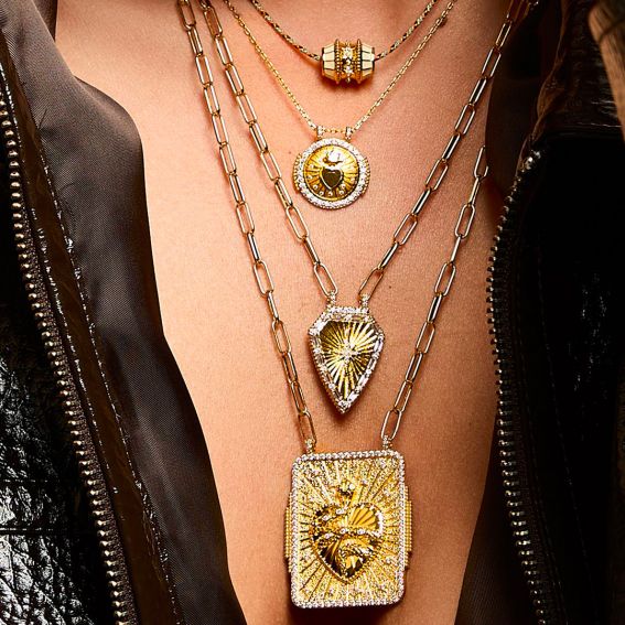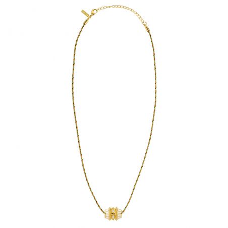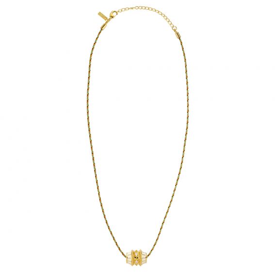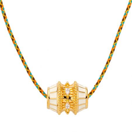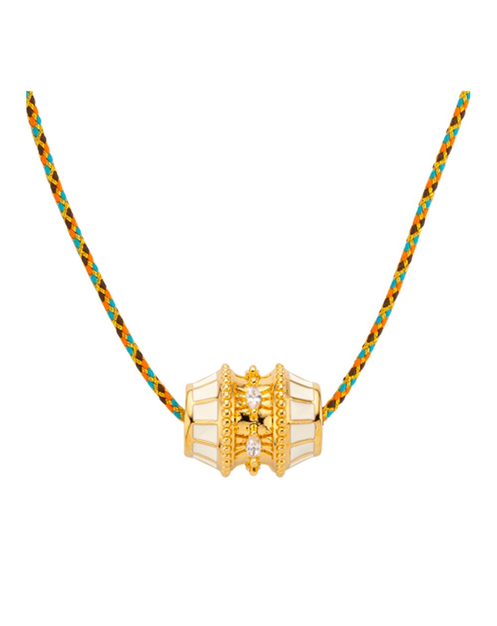 Le pendentif que vous avez partagé, appelé Ivory Talisman, présente un design cylindrique doré avec des détails en ivoire. Le pendentif est orné de petites pierres précieuses incrustées au centre, ajoutant une touche d'éclat et de sophistication. Il est suspendu à une corde tressée aux motifs colorés, combinant des tons de turquoise, marron et jaune, ce qui lui donne un aspect à la fois bohème et moderne.