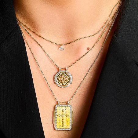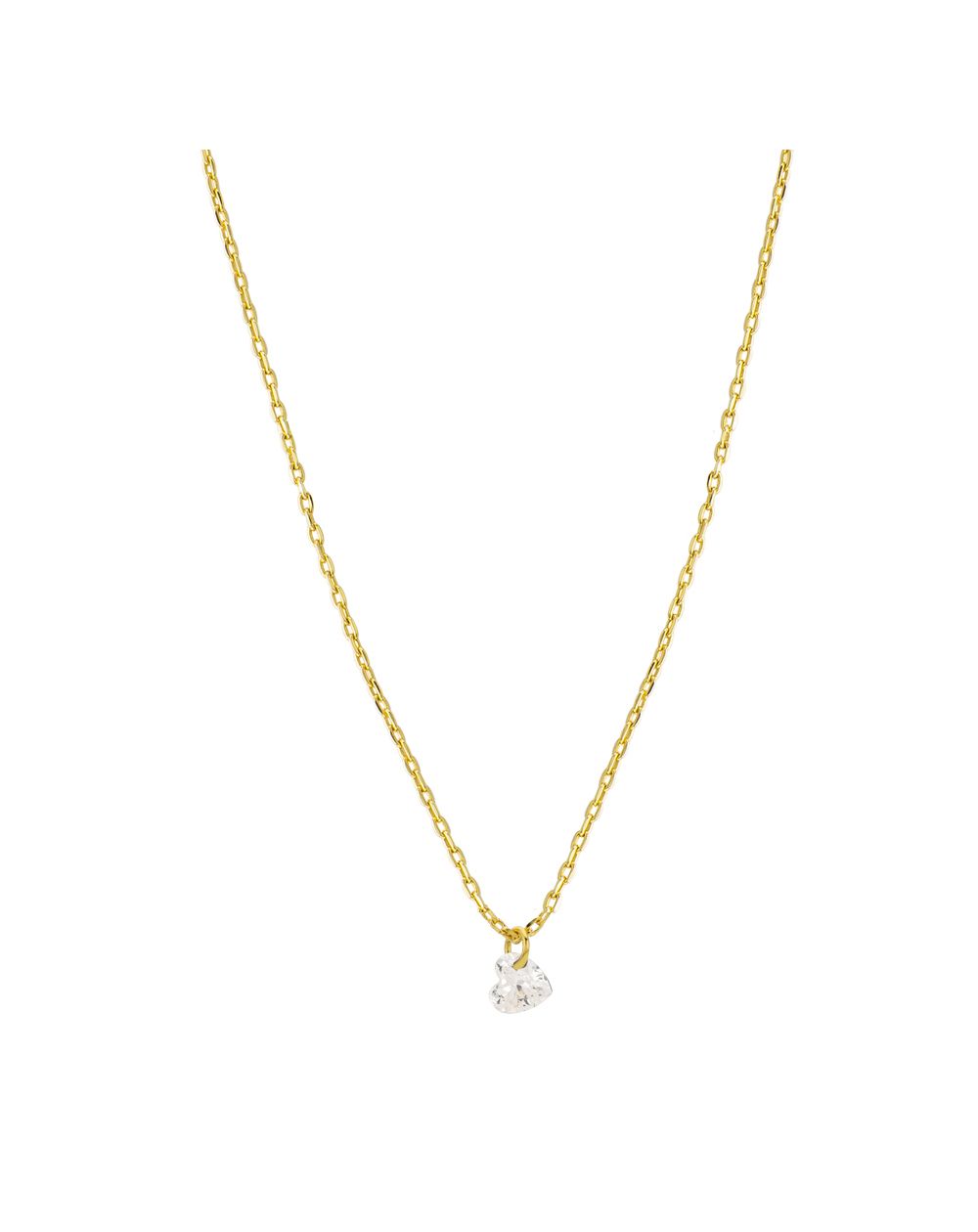 Le pendentif que vous avez partagé présente un design minimaliste et élégant. Il se compose d'une fine chaîne dorée, mettant en valeur un petit cœur en cristal blanc transparent. Le cristal en forme de cœur, suspendu délicatement, apporte une touche de raffinement et de simplicité à ce bijou.