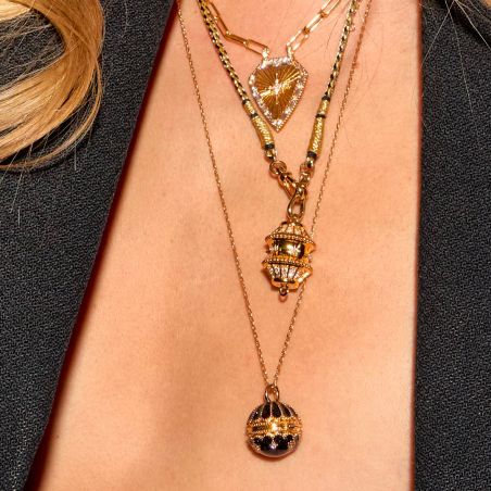 Le collier Black Shiny Protection de MYA BAY, finement doré à l’or recyclé 24 carats, est bien plus qu’un bijou. Doté d’un médaillon secret, ce collier unique peut s’ouvrir pour accueillir une pierre précieuse (6x8 mm) ou un grigri porte-bonheur, transformant chaque tenue en une déclaration personnelle et symbolique.
