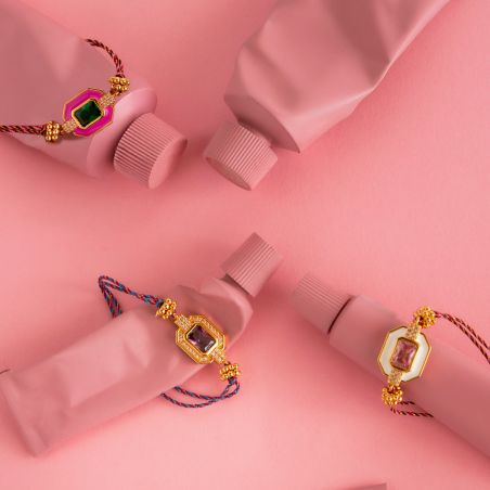 Inspirés de l’Art déco, ils arborent des lignes géométriques raffinées et une pierre scintillante blanche, verte ou violette. Dorés à l’or fin recyclé 24 carats, ils illuminent votre poignet avec élégance.
