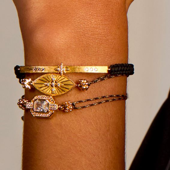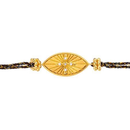 Le bracelet Chennai Iris signé Mya Bay allie finesse et éclat dans un design intemporel. Son médaillon en forme d’amande, finement travaillé et orné de délicats cristaux scintillants en forme de croix, capte la lumière avec élégance. Monté sur un cordon tressé noir et doré ajustable, il épouse parfaitement le poignet et s’adapte à toutes les morphologies.