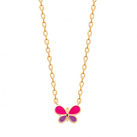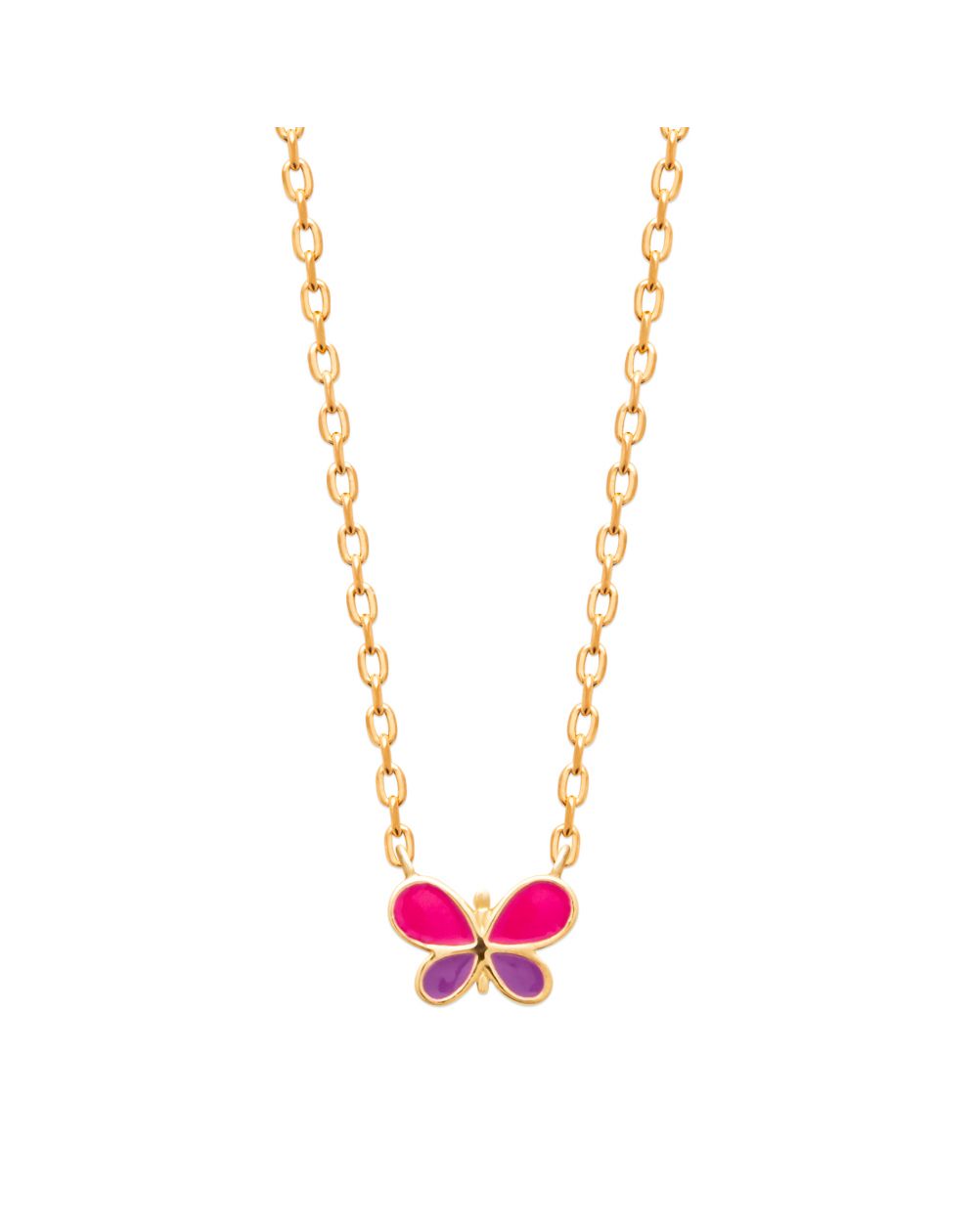 Ce collier en plaqué or 18 carats est un collier formé d'un papillon émaillé rose et mauve.