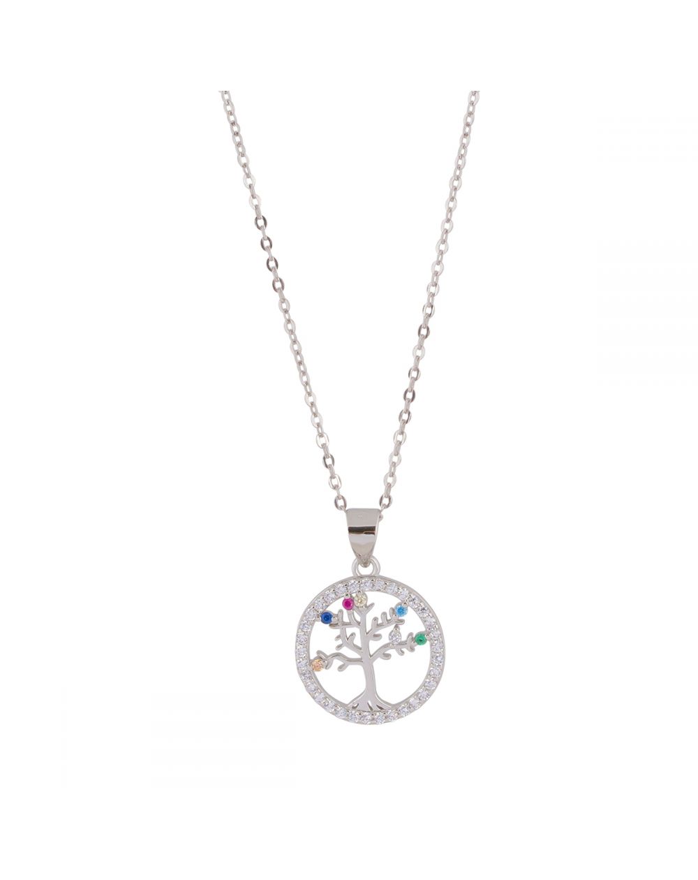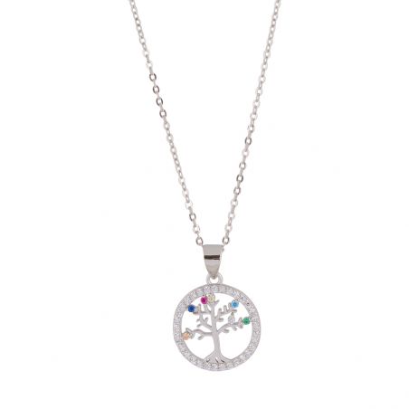 ce collier en argent 925 est réglable de 40cm à 43cm, son pendentif est un arbre de vie découpé composé de zircons blanc et de couleurs, il mesure 15mm