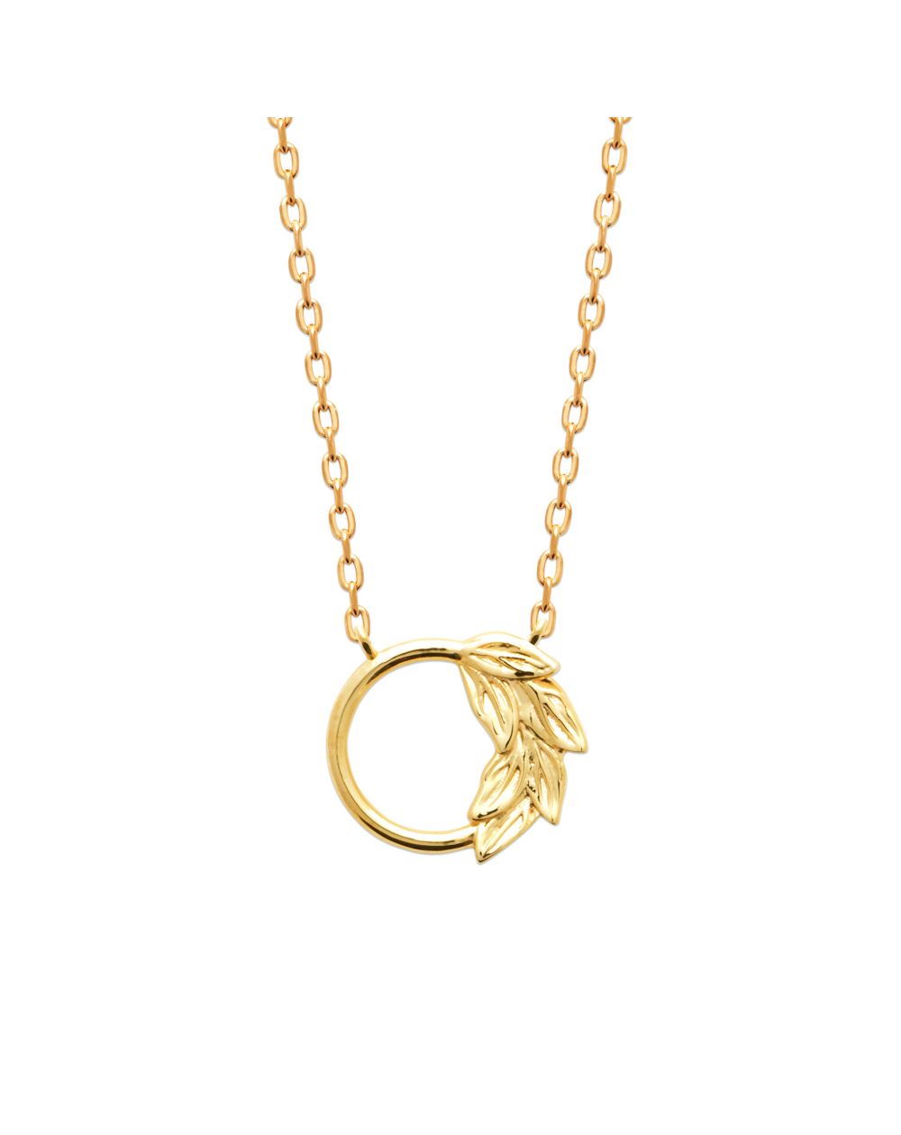 Ce collier est un collier plaqué or 18 carats doté d'un disque ouvert et de feuilles, son collier mesure 45 cm