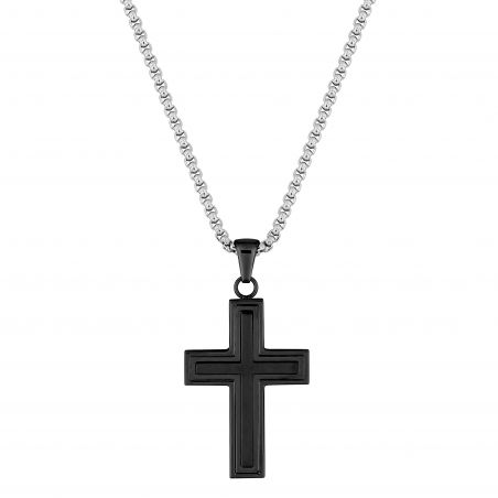 Ce collier pour homme est un collier en acier doté d'une grande croix de couleur noire et d'une chaine de couleur argent.