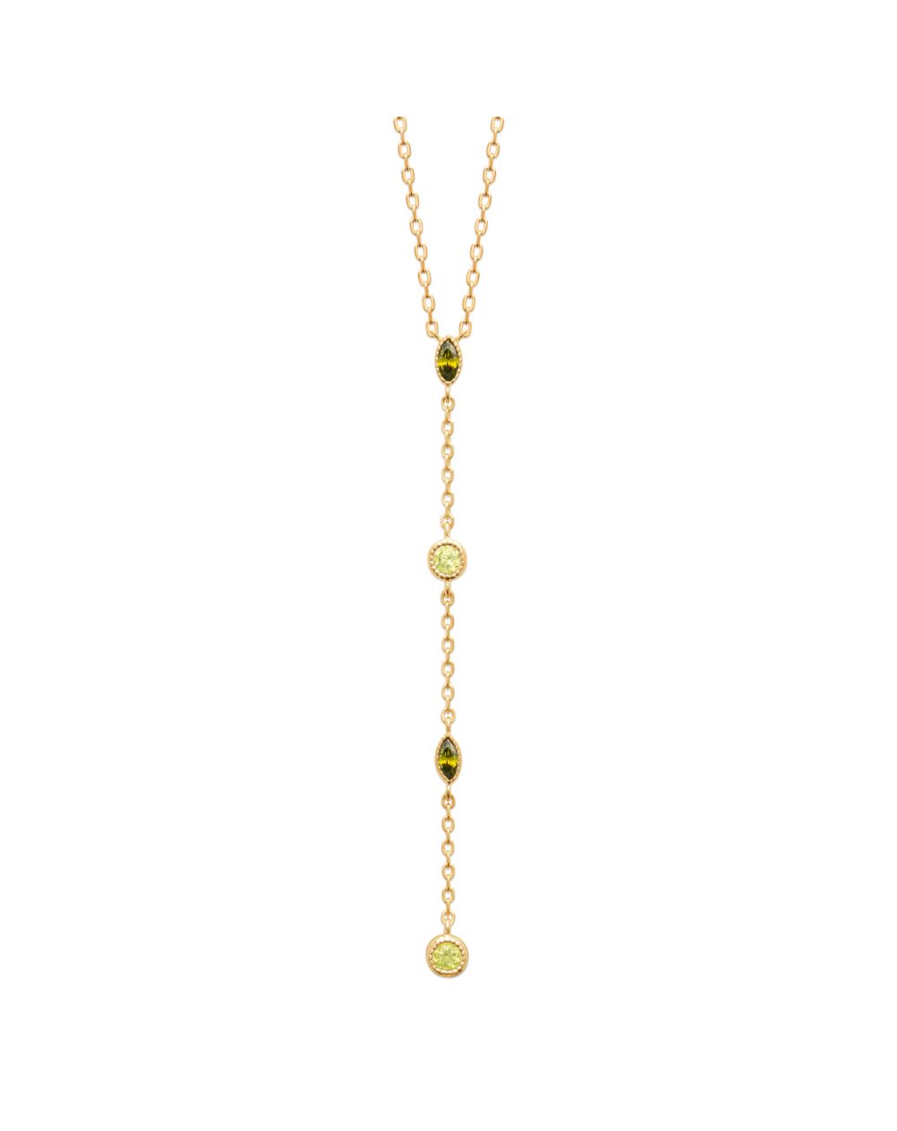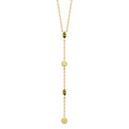 Ce collier est un collier plaqué 18k réglable en longueur. Ce collier est composé d'une chaine pendante composée de formes de pierres de couleurs.