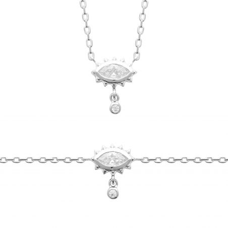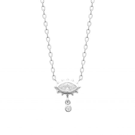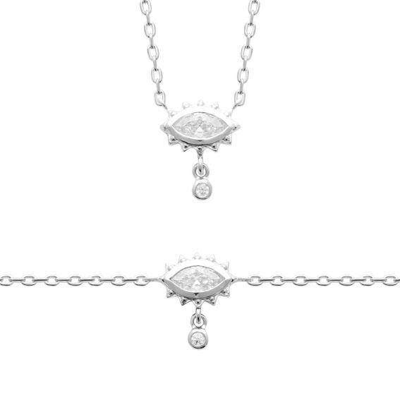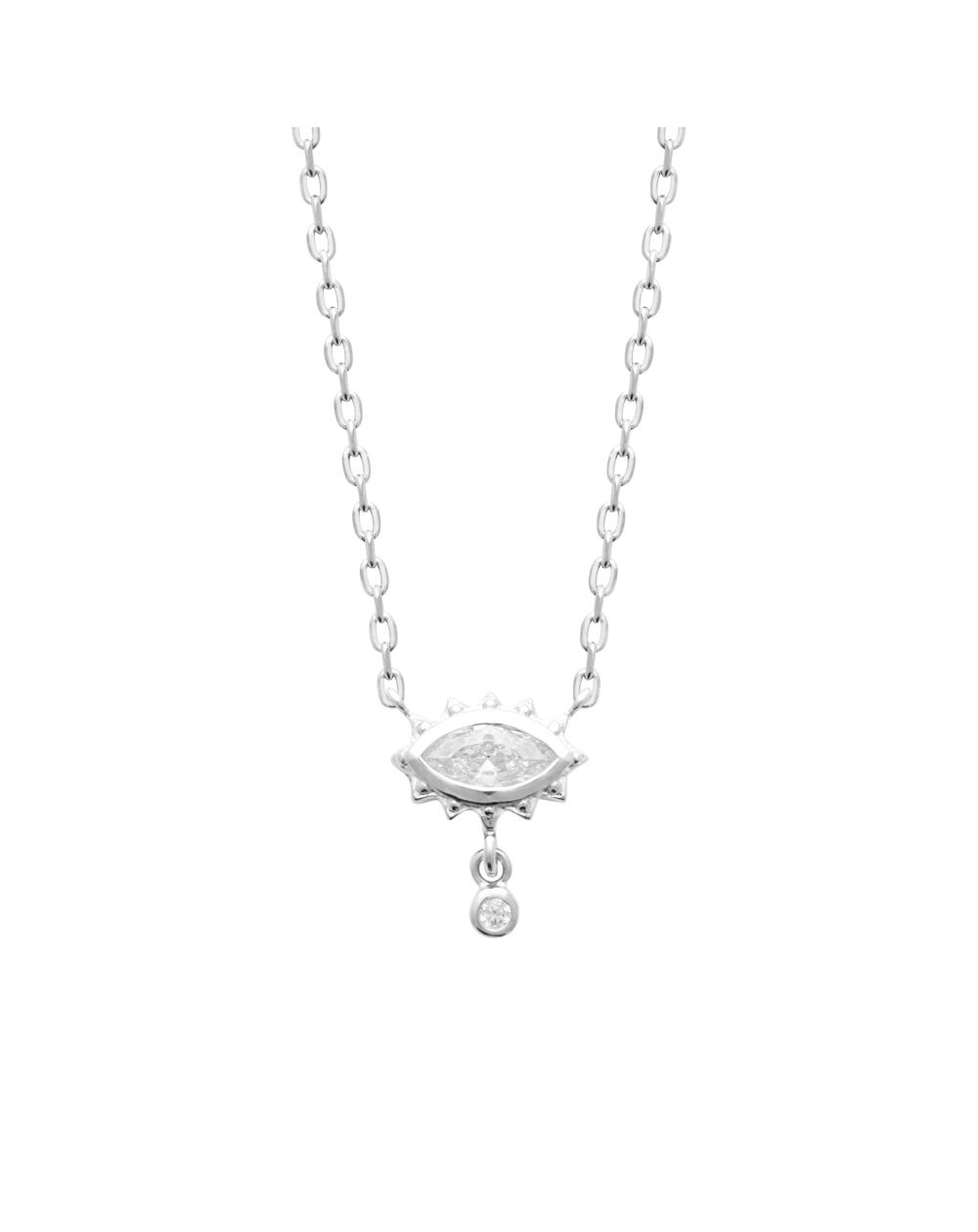Le collier en argent 925 dispose d'un pendentif en forme de losange étoilé avec une pierre brillante et un petit cristal rond suspendu en dessous, relié par une chaîne à maillons fins.
