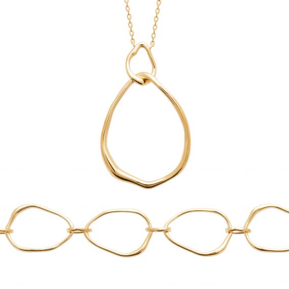 Ce collier en plaqué or se distingue par son design épuré et contemporain. Le pendentif est constitué de deux anneaux irréguliers entrelacés, créant un effet visuel unique et captivant. La chaîne délicate complète parfaitement le pendentif, ajoutant une touche de sophistication et de modernité. La finition polie des anneaux reflète délicatement la lumière, apportant une lueur subtile et élégante.