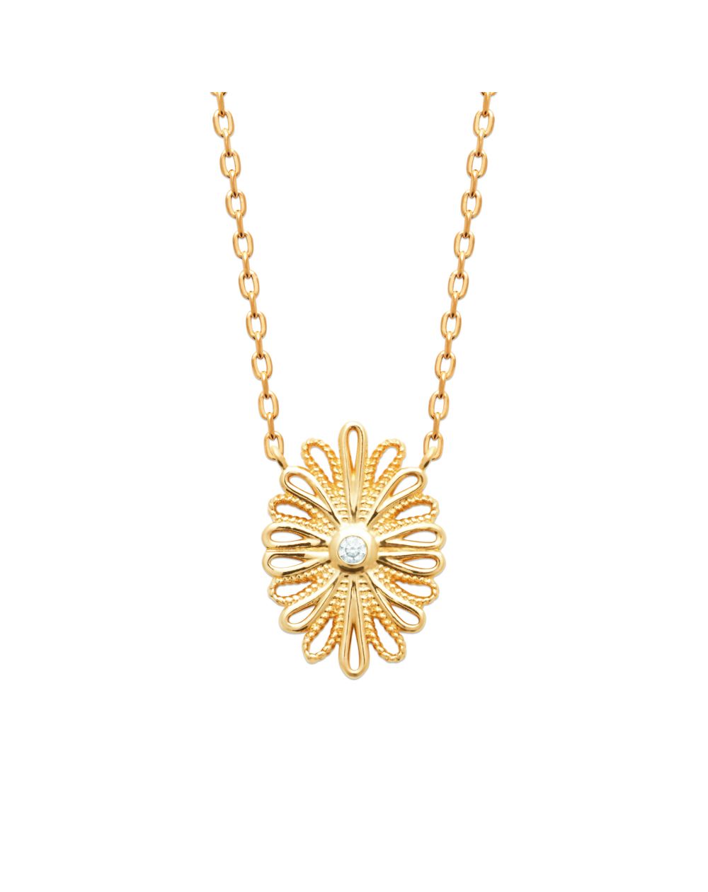 Ce collier en plaqué or est d'une élégance discrète avec son design délicat. Il comporte une chaîne fine et un motif central ajouré en forme de fleur ou de soleil, ajoutant une touche d'élégance subtile. Parfait pour un look minimaliste et raffiné, ce bracelet peut être porté seul ou en superposition avec d'autres collier.