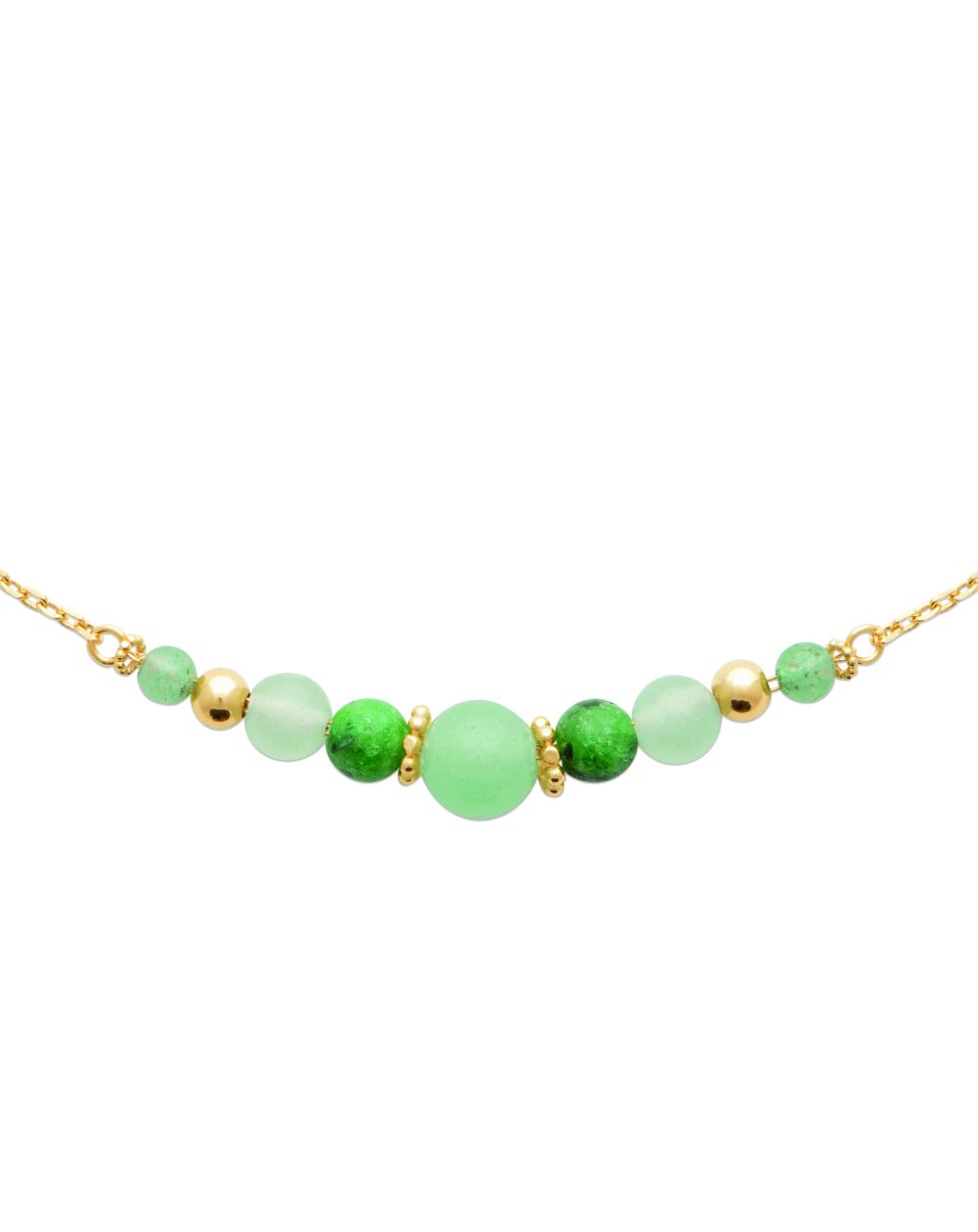 Sublimez votre décolleté avec ce magnifique collier aventurine doré plaqué or 18 carats. Orné de perles d'aventurine verte, ce bijou raffiné est parfait pour ajouter une touche de sophistication à votre style. L'aventurine, pierre réputée pour ses vertus apaisantes et porte-bonheur, est sublimée par des petites perles dorées, créant un contraste harmonieux et éclatant.