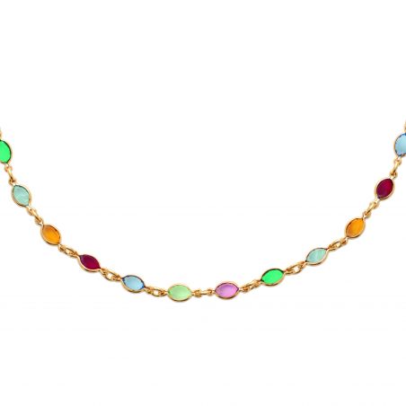 Ce collier doré plaqué or est un collier femme serti de pierres colorées en oxyde de zirconium et en forme d'amande. Ce collier doré est réglable en longueur de 42 à 45cm.