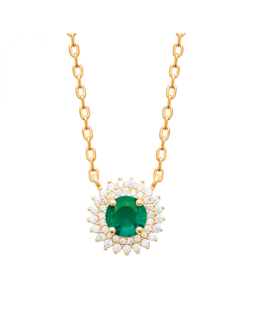 Ce collier plaqué or 18k est un collier en forme de soleil double serti de pierres en oxyde de zirconium dont une est de couleur émeraude. Ce collie est réglable en longueur de 42 à 45cm.