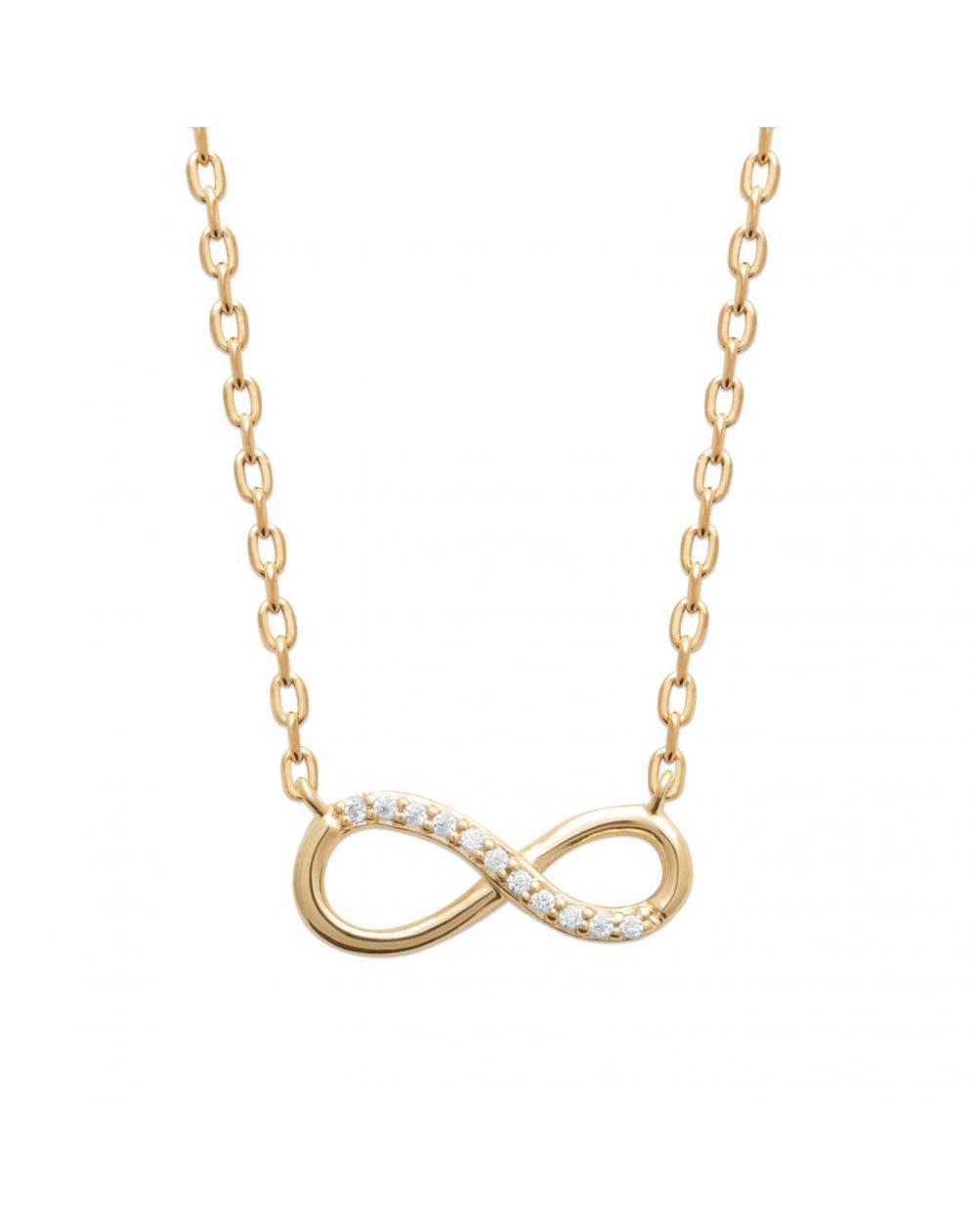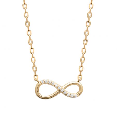 Ce collier infini en plaqué or 18k incarne l’élégance et la symbolique de l’éternité. Son pendentif en forme d’infini, partiellement serti de zircons scintillants, illumine le décolleté avec finesse.