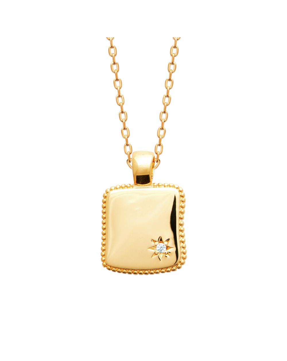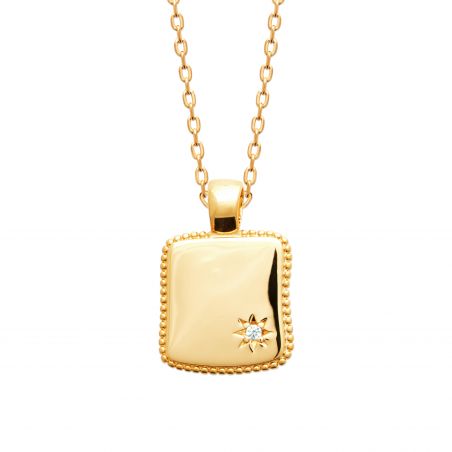 Laissez-vous séduire par ce collier médaille rectangulaire en plaqué or 18 carats, une création lumineuse et sophistiquée. Son pendentif aux contours perlés se distingue par sa forme géométrique moderne et son oxyde de zirconium étincelant, délicatement serti dans un motif étoilé.