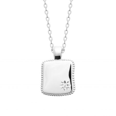 Sublimez votre style avec ce collier médaille rectangulaire empierrée en argent 925 rhodié, une création raffinée au design moderne et lumineux. Son pendentif rectangulaire aux bords perlés délicatement travaillés reflète la lumière avec éclat, tandis qu’un oxyde de zirconium scintillant vient illuminer une étoile finement gravée.