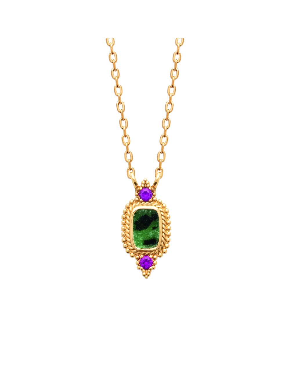Son pendentif met à l’honneur une pierre de jaspe dalmatien aux nuances naturelles de vert profond, sublimée par deux zirconiums violets qui apportent une touche lumineuse et précieuse.