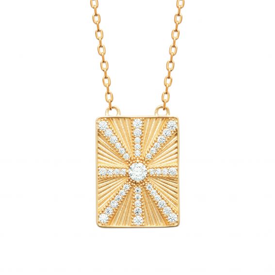 Le collier Rayon d’Or séduit par son pendentif rectangulaire finement travaillé, orné de rayons gravés qui convergent vers un oxyde de zirconium central, symbole de lumière et d’éclat. Les oxydes de zirconium délicatement sertis le long des lignes rayonnantes captent la lumière avec intensité, offrant une brillance élégante et sophistiquée.