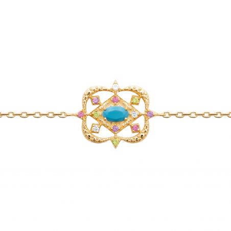 Au centre, un délicat motif ornemental met en valeur une pierre turquoise lumineuse, entourée de pierres colorées qui apportent une touche vibrante et raffinée.