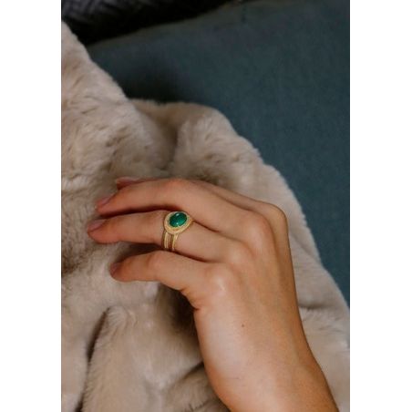La ligne Demeter met en avant des pierres naturelles comme l'agate VERTE, symbolisant respectivement la terre et l'amour mythologique, encadrées par un double jonc au design antique.