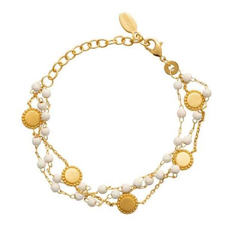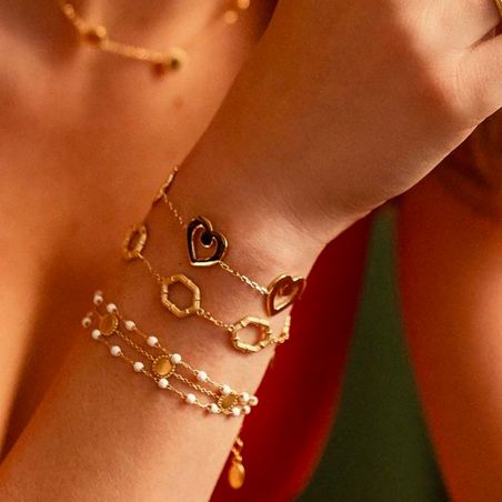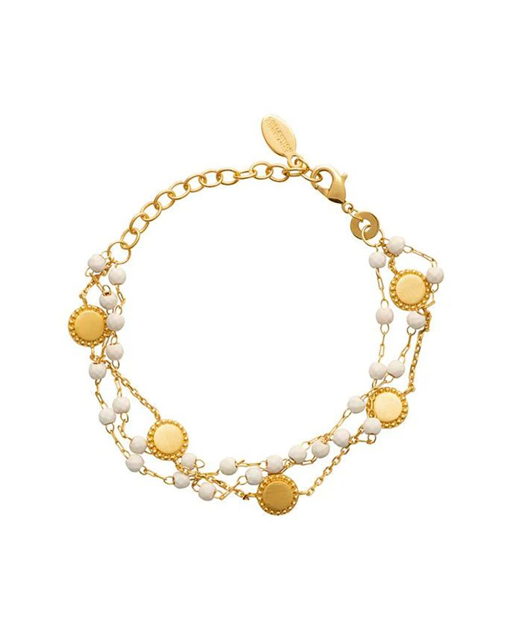 Le bracelet Thalie célèbre la muse de la comédie et sa joie de vivre. Orné de petites pierres en calcédoine blanche, entrelacées autour d'une chaîne dorée, ce bijou délicat fait référence à la couronne de lierre portée par la muse. Parfait pour illuminer vos tenues, il ajoute une touche d'élégance et de gaieté.