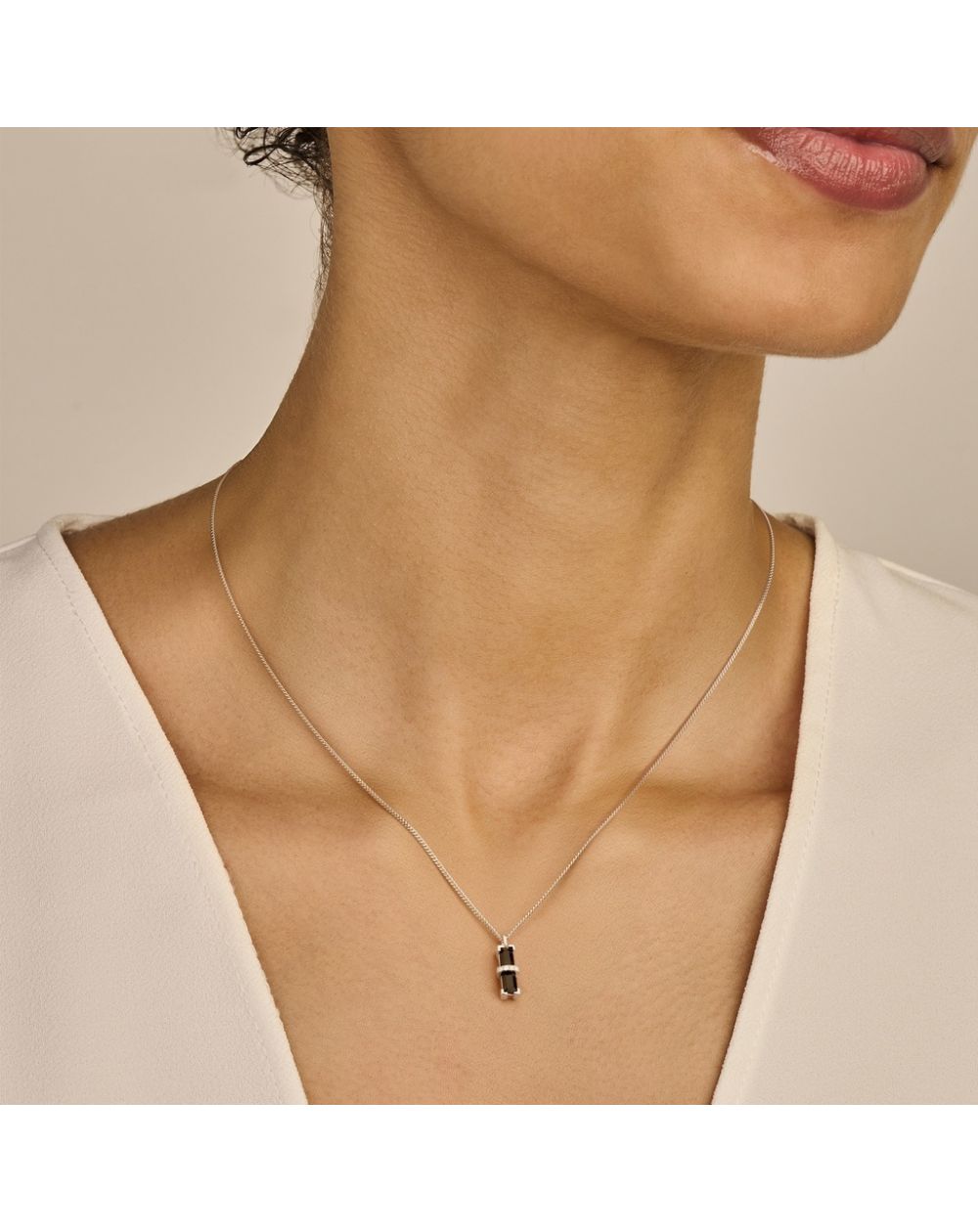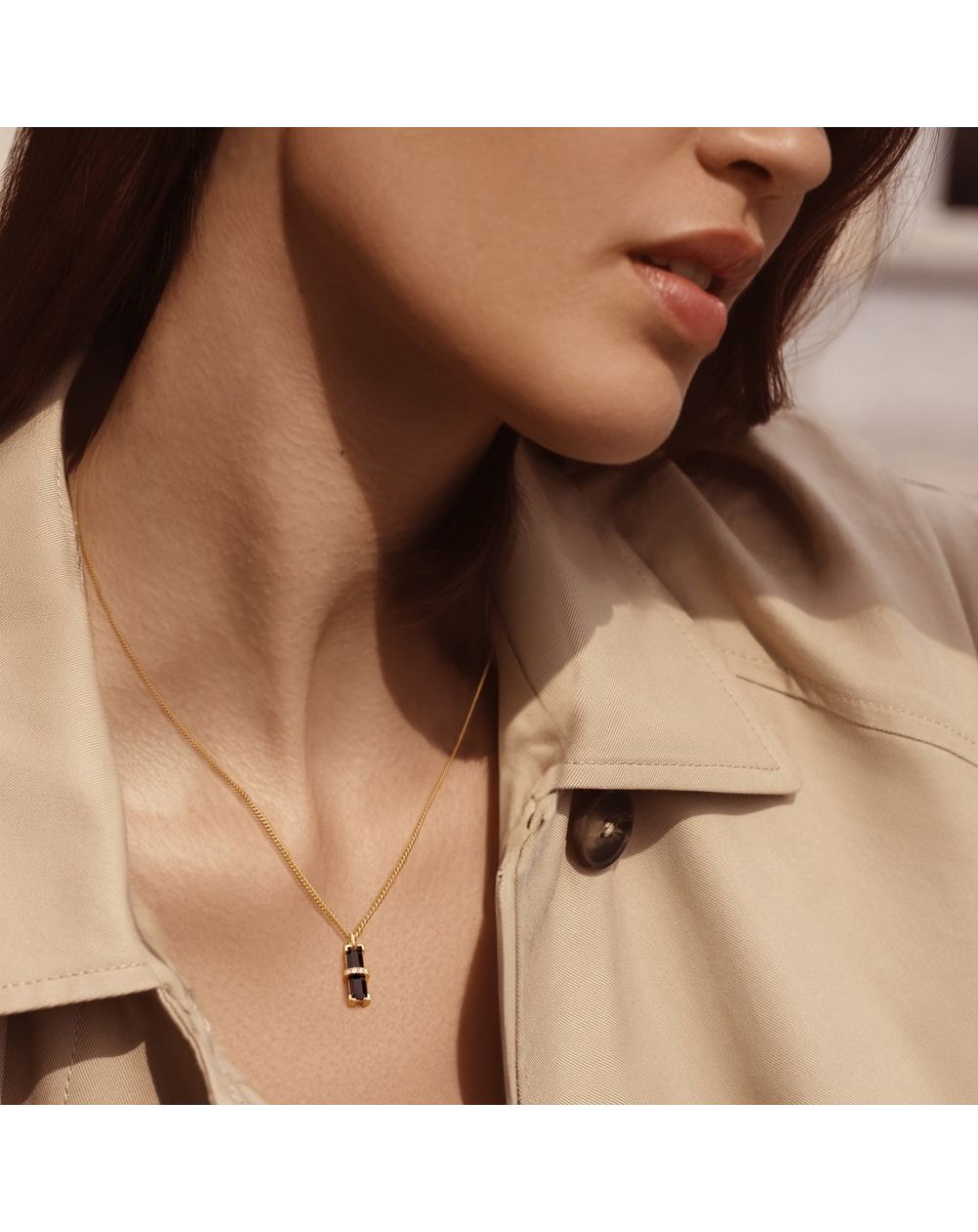 Le collier est composé de 4 diamants mesurant 1mm chacun et d'une pierre Onyx rectangulaire, le pendentif mesure 4,5mm de large sur 11mm de haut.