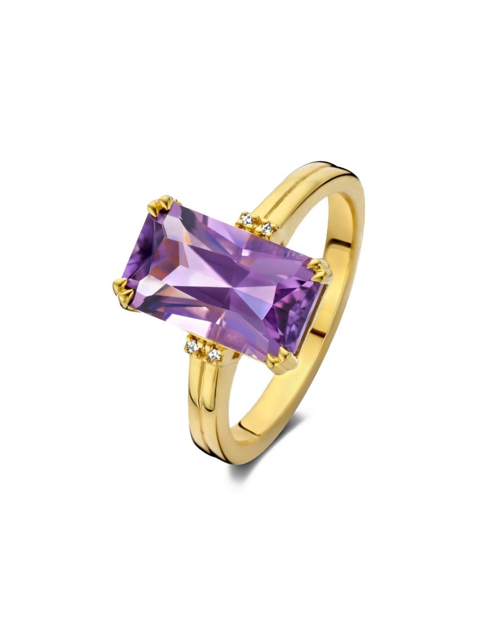 Cette bague de la marque Diamanti Per Tutti est une bague en argent 925 (argent rhodié ou doré à l'or fin 18 carats) sertie d'une améthyste et de 4 vrais diamants blancs scintillants.