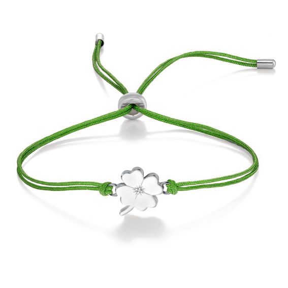 Un bracelet porte-bonheur en corde verte, orné d'un charm trèfle à quatre feuilles en argent sterling 925. Une délicate gravure en forme d'étoile orne sa surface, avec un brillant diamant blanc naturel en son cœur. Avec cinq autres "embracelets" disponibles, vous pouvez créer un ensemble unique ou les partager avec vos amis comme symbole d'une amitié éternelle.