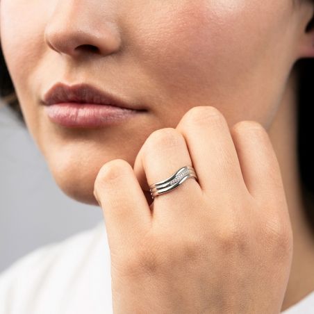 Conçue en argent sterling 925, cette bague est disponible en plaqué or jaune, plaqué or blanc ou plaqué or rose, permettant de s’adapter à tous les styles. Son volume harmonieux et ses lignes ondulées en font une pièce de caractère, à la fois moderne, féminine et intemporelle.