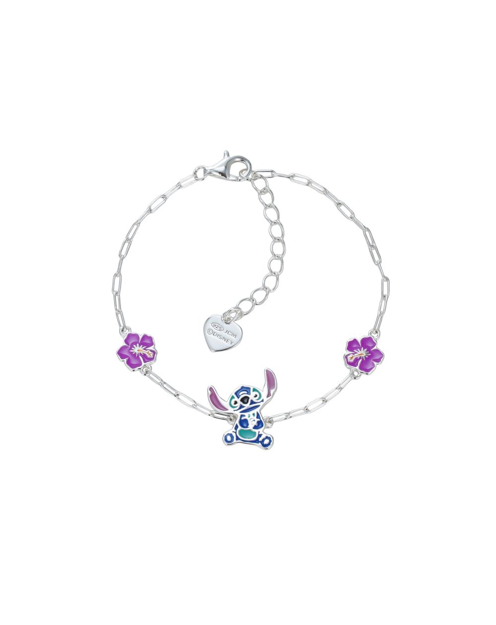 Ce bracelet en argent Disney Stitch est orné d’un charm représentant Stitch en émail coloré, accompagné de deux fleurs d’hibiscus violettes pour une touche tropicale. Sa chaîne fine et ajustable, agrémentée d’un pendentif en forme de cœur gravé, en fait un bijou délicat et ludique. Idéal pour les fans de Lilo & Stitch, ce bracelet allie élégance et esprit ensoleillé.
