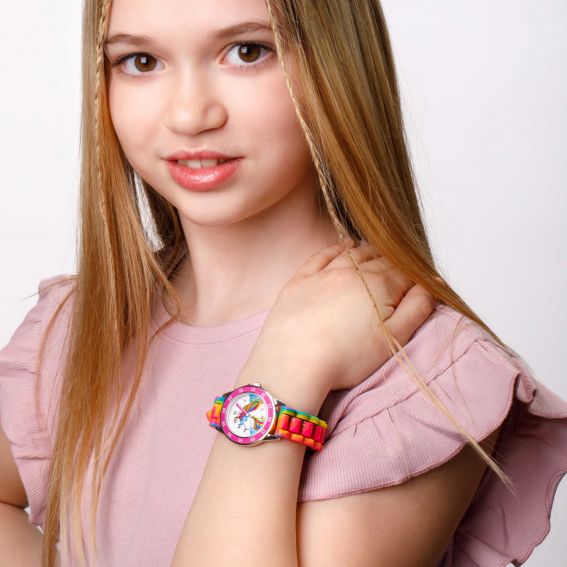Cette montre analogique La Reine des Neiges arbore un design enchanteur avec un bracelet violet pailleté et un cadran illustré des personnages emblématiques d'Elsa et Anna. Ses chiffres bien visibles facilitent l’apprentissage de l’heure. Idéale pour les jeunes fans de Frozen, elle allie magie et praticité pour un look féérique au quotidien.