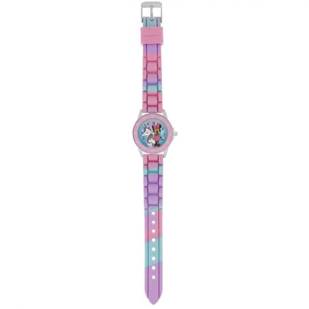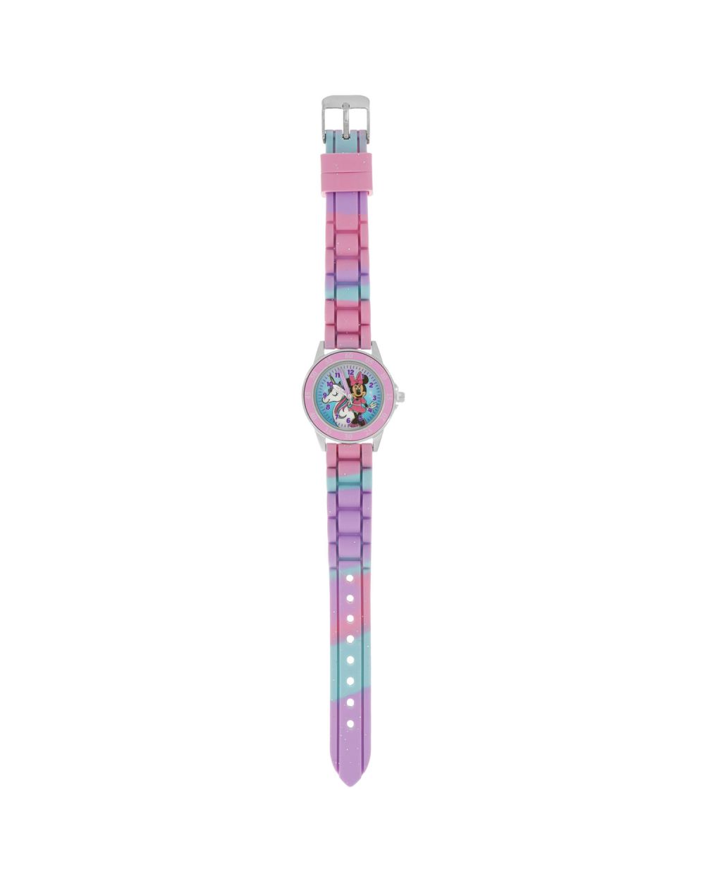Cette montre analogique Minnie Mouse arbore un design pastel féérique avec un bracelet dégradé rose, violet et bleu, agrémenté de paillettes scintillantes. Son cadran illustré met en scène Minnie aux côtés d’une licorne magique, avec des chiffres bien visibles pour faciliter l’apprentissage de l’heure. Idéale pour les jeunes fans de Disney, elle allie charme et praticité pour un look enchanteur au quotidien.