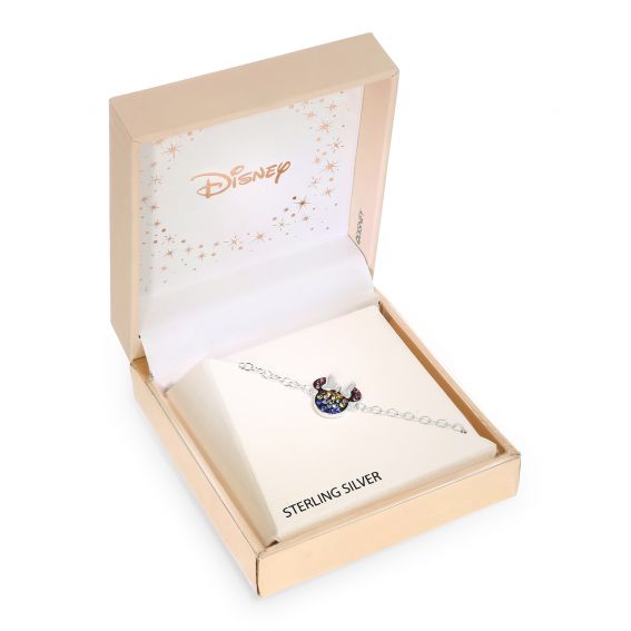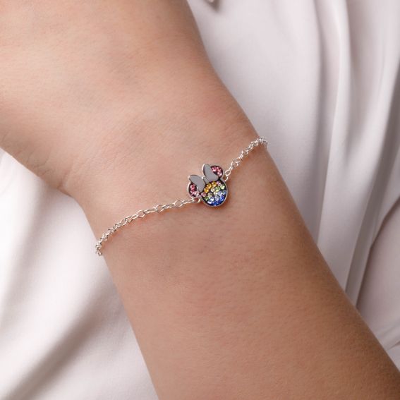 Ce bracelet en argent Disney Minnie Mouse arbore un charm en forme de tête de Minnie, orné d’un nœud délicat et de cristaux multicolores scintillants. Son design raffiné et ajustable en fait un bijou élégant et ludique, parfait pour ajouter une touche féérique et colorée au poignet des fans de Disney.