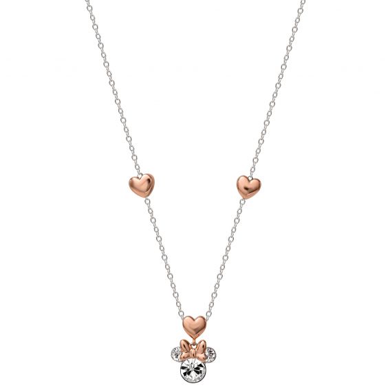 Ce collier Disney Minnie Mouse en argent et plaqué or rose incarne l’élégance et la douceur avec son pendentif raffiné représentant Minnie en cristaux scintillants. Orné de délicats cœurs dorés le long de la chaîne, il apporte une touche romantique et féérique. Un bijou sophistiqué et intemporel, parfait pour les fans de Disney en quête de charme et de brillance.