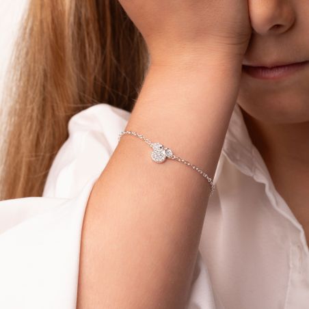 Ce bracelet Disney en argent sterling est orné d’un pendentif en forme de Minnie Mouse, pavé de pierres étincelantes. Son design raffiné et son fermoir ajustable en font un bijou élégant et intemporel. Parfait pour les amoureux de l’univers Disney, ce bracelet apporte une touche de magie et de sophistication à chaque tenue.