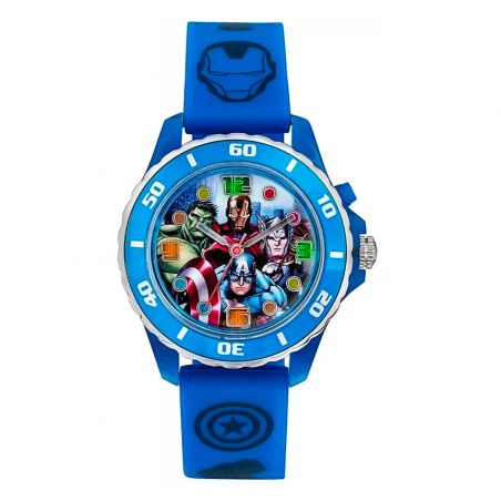 Son bracelet en silicone bleu souple, décoré des symboles emblématiques des Avengers, assure confort et résistance au quotidien. Grâce à son affichage analogique avec aiguilles “Hour” et “Minute”, cette montre est idéale pour initier les enfants à la lecture de l’heure tout en portant fièrement leurs héros favoris.