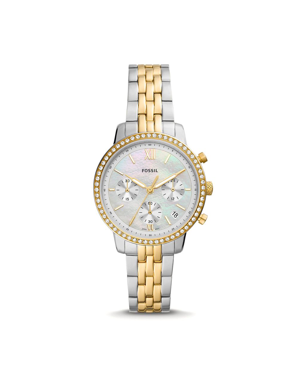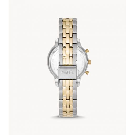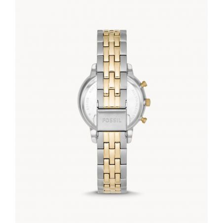 Cette montre de marque Fossil pour femme est une montre dotée d’un cadran nacré brillant, d’un mouvement chronographe et d’un bracelet en acier inoxydable bicolore.