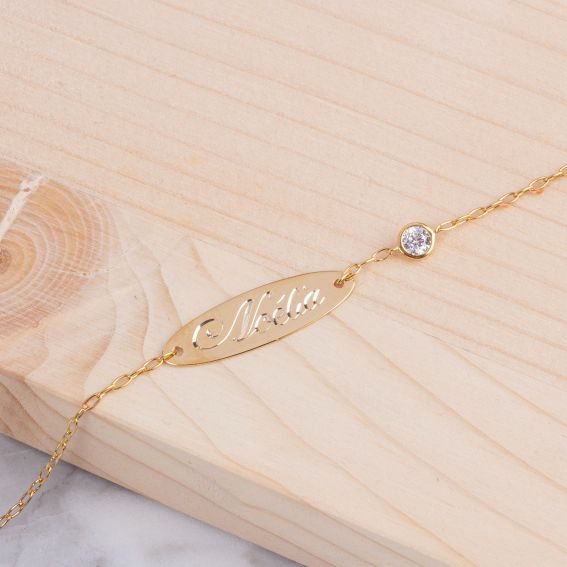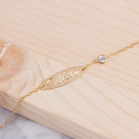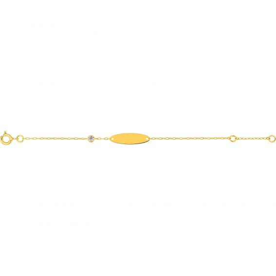 Ce matricule pour enfant est un bracelet en or 9 carats doté d'une petite plaquette qui peut être gravée d'un prénom et d'une date. Ce bracelet est réglable en longueur (12 à 14cm).