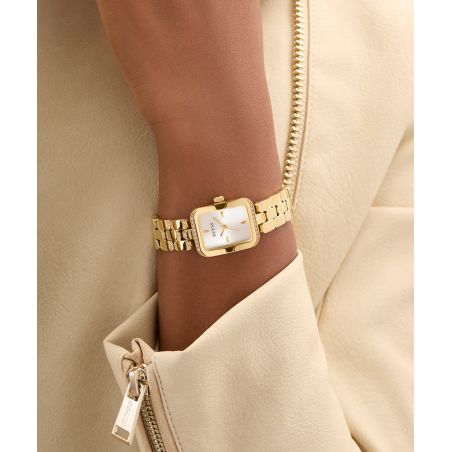 Féminine, raffinée et intemporelle, la Guess Isla revisite le chic à la façon rétro. Son boîtier rectangulaire doré est subtilement bordé de cristaux étincelants, ajoutant une touche lumineuse sans ostentation. Le cadran argenté brossé à l’effet soleil, épuré et élégant, fait ressortir les index dorés pour une lisibilité parfaite.