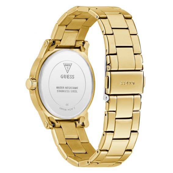 Son bracelet en acier inoxydable doré au fini poli miroir offre un rendu lumineux et sophistiqué, tout en garantissant robustesse et confort. Le mouvement quartz analogique assure une précision fiable au quotidien.