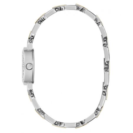 Avec son boîtier rond de 23 mm en acier inoxydable bicolore, cette montre séduit par sa silhouette fine et raffinée. Sa lunette ornée du logo GUESS et de cristaux attire immédiatement le regard et apporte une touche signature unique.