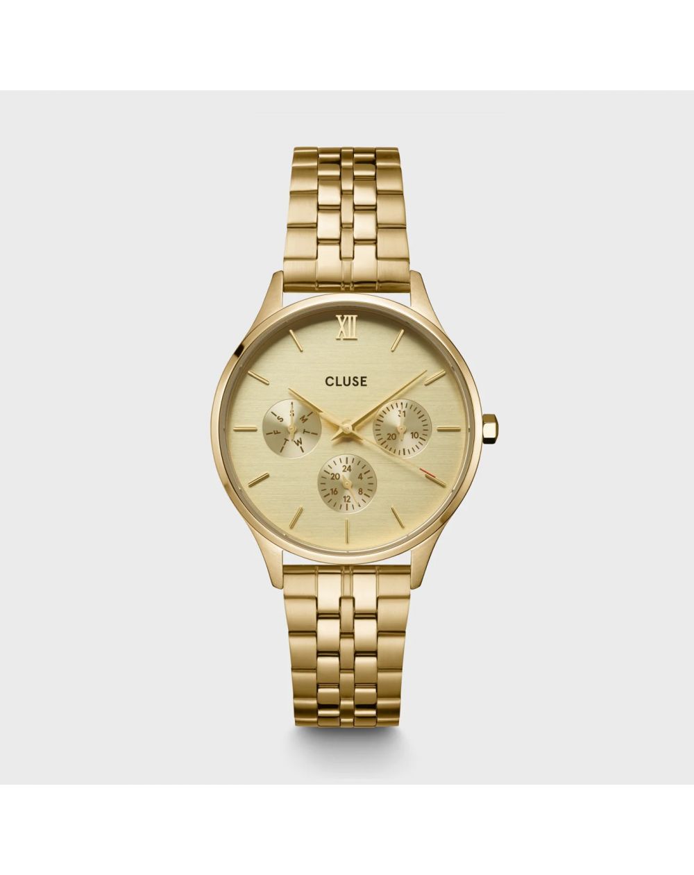 Ajoutez une touche de style et de sophistication à vos tenues de tous les jours avec la montre Cluse Minuit Multifunction. Dotée d’un boîtier rond de couleur or de 34 mm, d’un bracelet à 5 maillons et de 3 sous-cadrans avec indication du jour, cette montre entièrement de couleur or est l’accessoire de chronométrage par excellence !