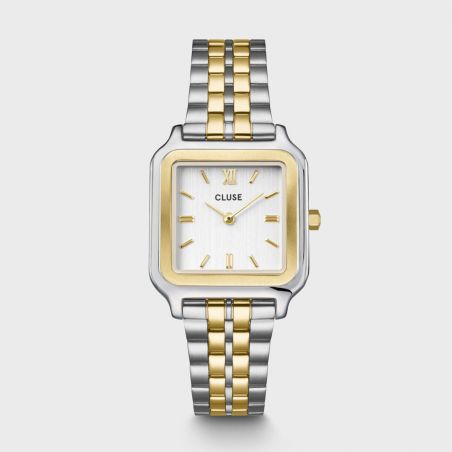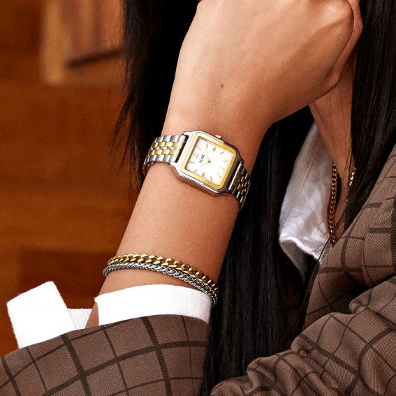 Boîtier : La montre présente un boîtier carré de 28 mm, qui apporte une touche de sophistication et d'originalité. Le boîtier est bicolore, combinant les nuances de l'or et de l'argent pour un effet élégant et moderne.